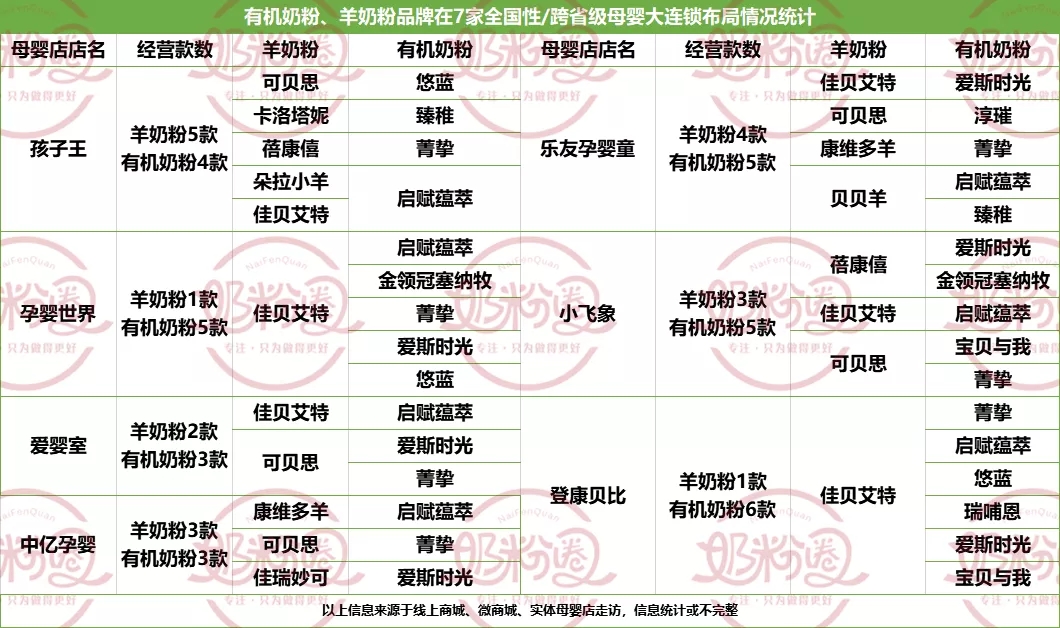 由上表所示,在统计的7家全国性大型母婴连锁中,孕婴世界、爱婴室、乐友孕婴童、小飞象、登康贝比5家经营的有机奶粉款数都比羊奶粉多,其中,孕婴世界和登康贝比都只布局了一款羊奶粉和至少5款有机奶粉。