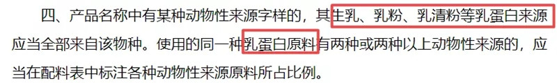 如下图所示,从第四条规定来看,“生乳、乳粉、乳清粉等乳蛋白来源应当全部来自该物种”,以及“使用的同一种乳蛋白原料有两种或两种以上动物性来源的,应当在配料表中标注各种动物性来源原料所占比例。”可见,新规侧重奶基原料方面。
