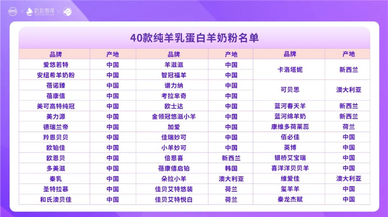 为此,我们特别为大家盘点了当下乳蛋白奶基原料全部来源于羊的40款羊奶粉名单,如下图所示:
